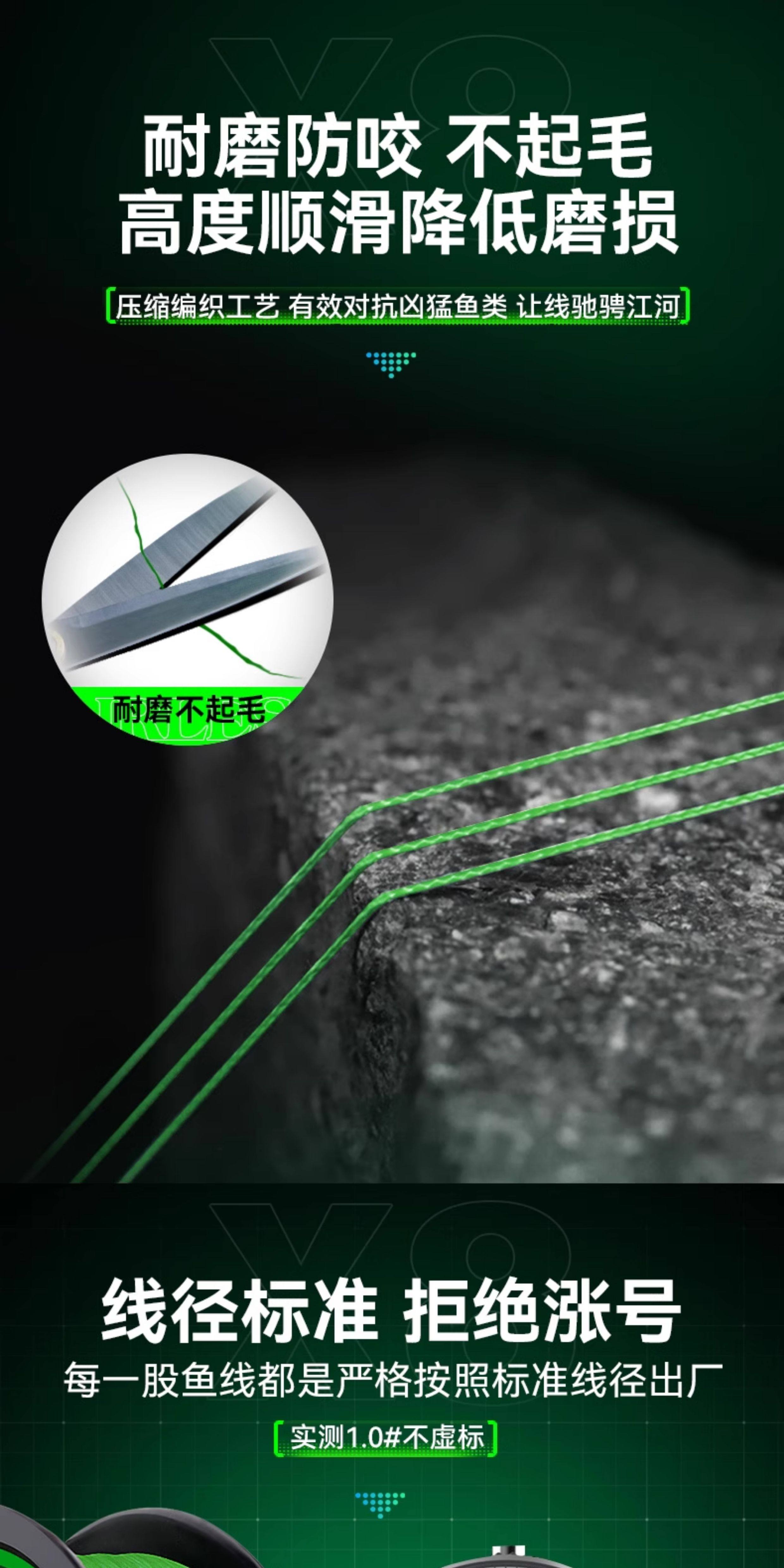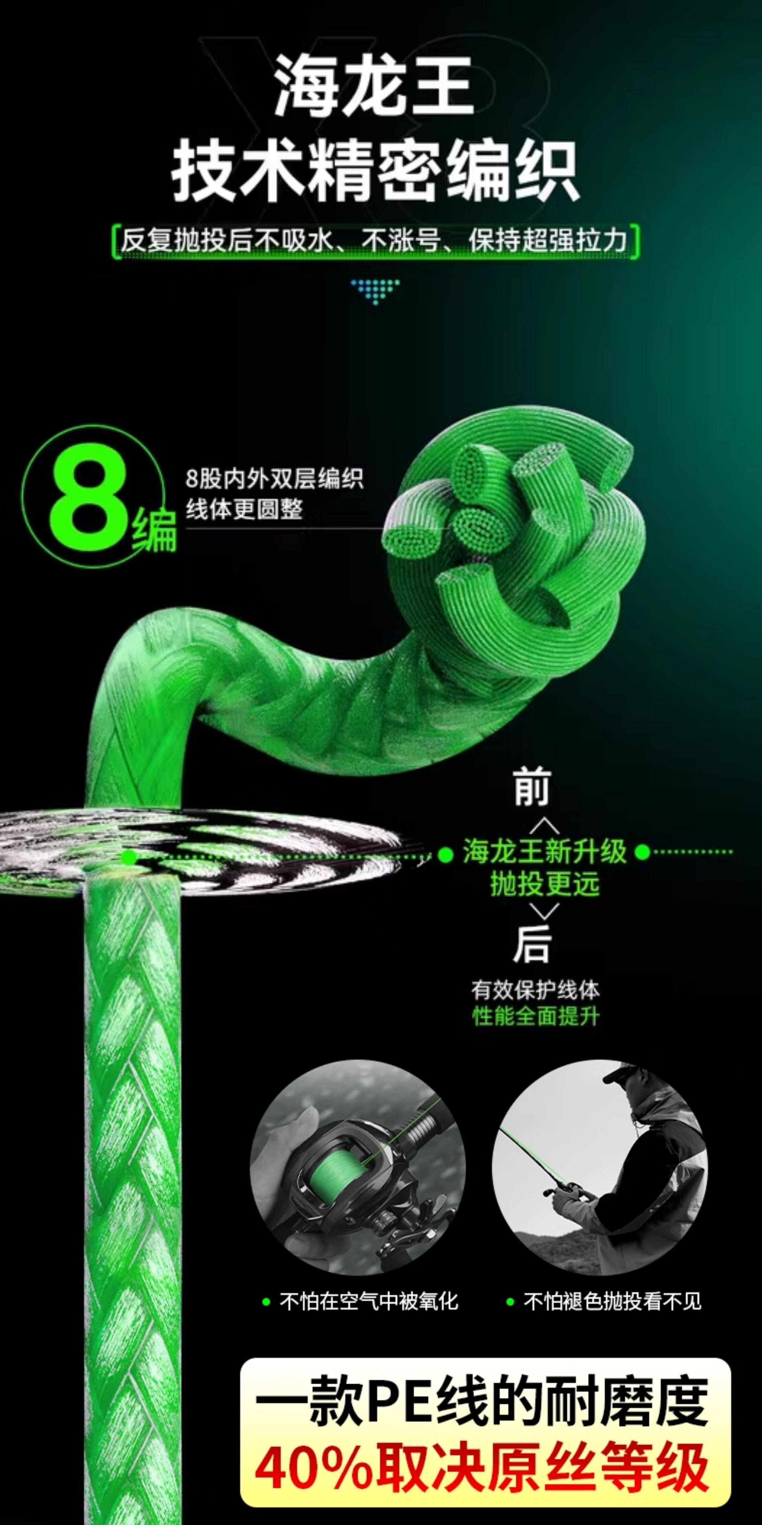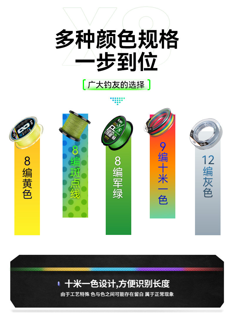 | 颜色分类 | 8编军绿色100米, 8编颜色随机100米, 8编飞龙三代绿白100米, 8编飞龙三代绿白150米, 8编十米一色100米, 8编龙六超顺滑100米, 8编军绿300米, 8编军绿500米, 8编飞龙青绿300米, 8编飞龙青绿500米, 9编军绿100米, 9编军绿150米, 9编十米一色100米, 9编十米一色150米, 9编军绿300米, 9编十米一色300米, 12编军绿100米, 12编十米一色100米, 12编强拉力150米 |