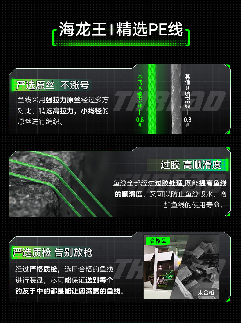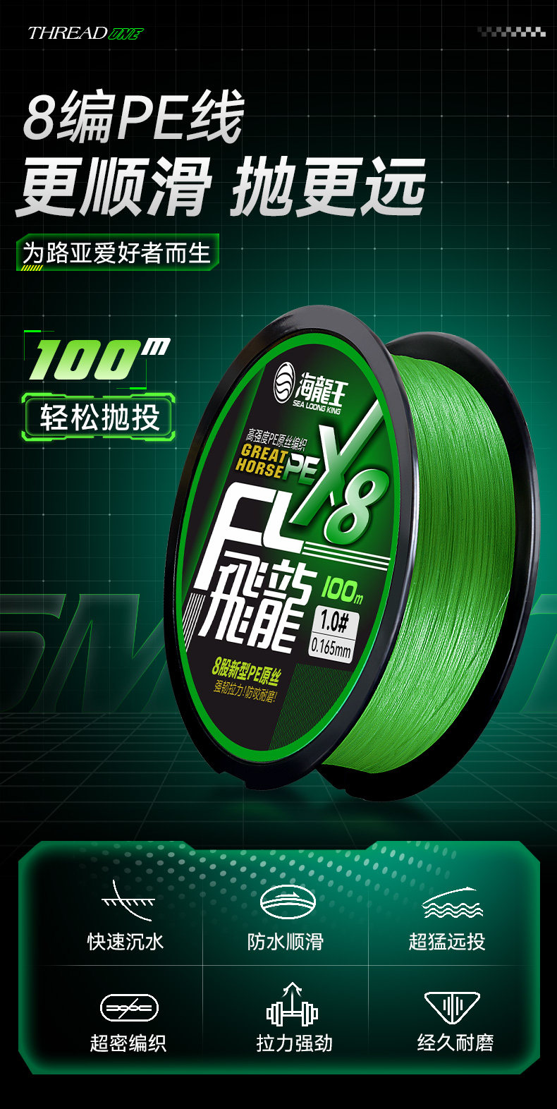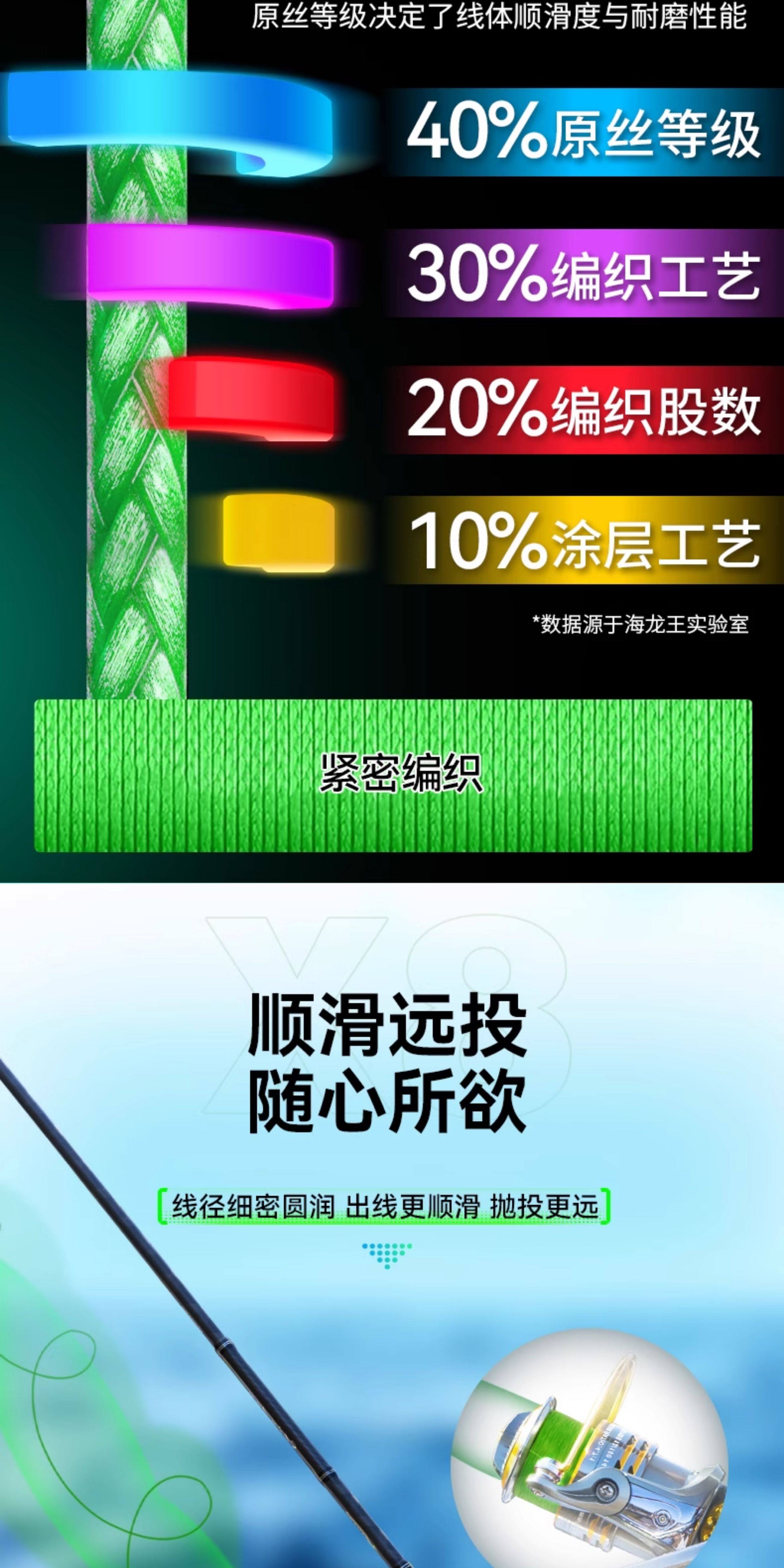| 颜色分类 | 8编军绿色100米, 8编颜色随机100米, 8编飞龙三代绿白100米, 8编飞龙三代绿白150米, 8编十米一色100米, 8编龙六超顺滑100米, 8编军绿300米, 8编军绿500米, 8编飞龙青绿300米, 8编飞龙青绿500米, 9编军绿100米, 9编军绿150米, 9编十米一色100米, 9编十米一色150米, 9编军绿300米, 9编十米一色300米, 12编军绿100米, 12编十米一色100米, 12编强拉力150米 |